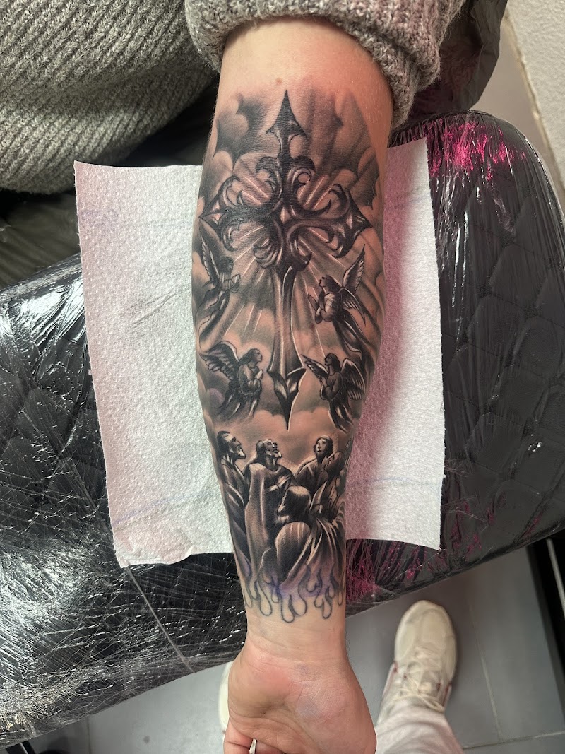 Groot zwart-wit kruis met engelen en figuren op onderarm.