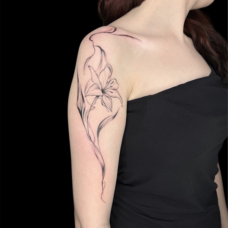 Fineline lelie met vloeiende lijnen op bovenarm en schouder.