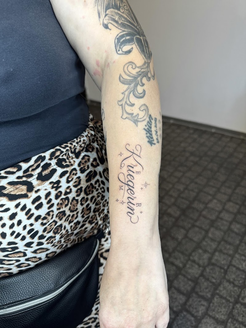 Fineline script tattoo 'Kriegerin' met sterretjes op onderarm.
