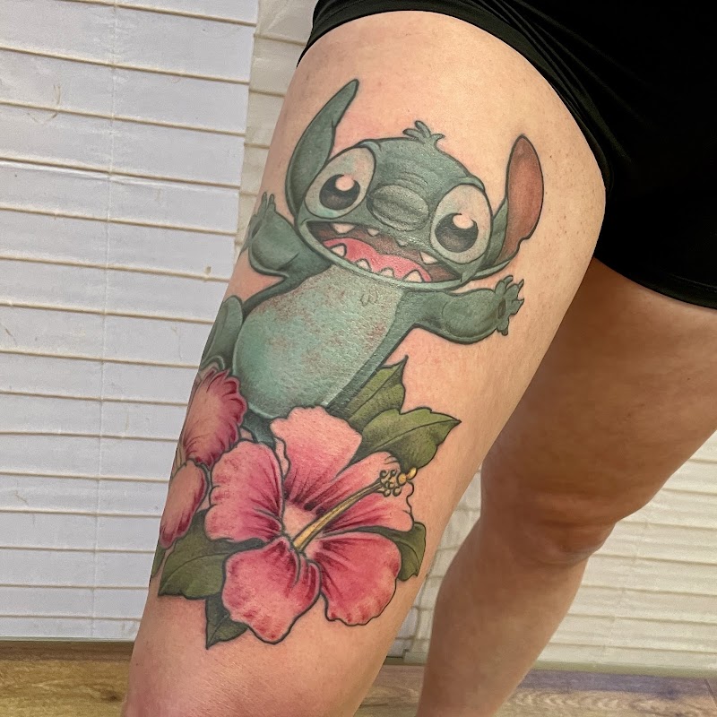 Kleurrijke Stitch met hibiscus bloemen op bovenbeen.