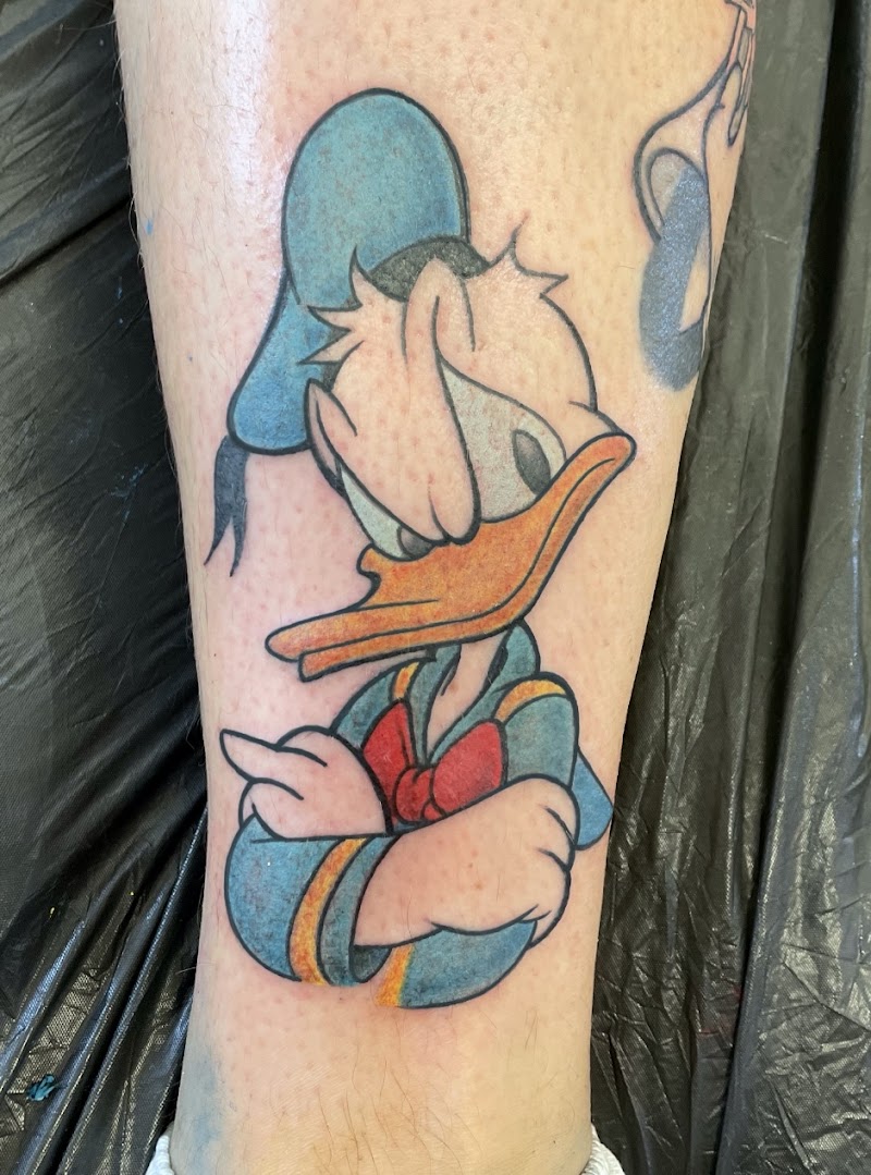 Kleurrijke Donald Duck tattoo met gekruiste armen op onderbeen.