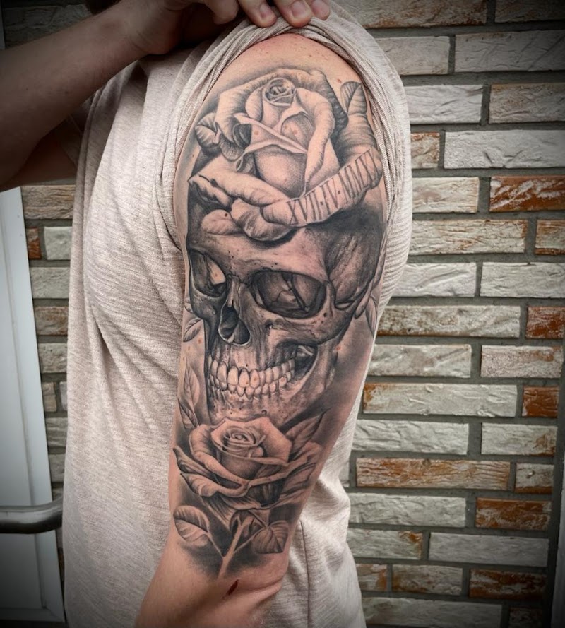 Realistische schedel met rozen en Romeinse cijfers op bovenarm.