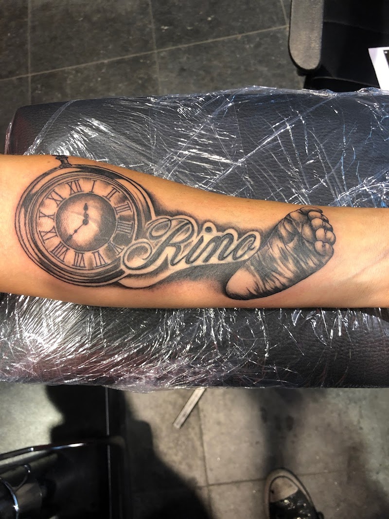 Zwart-wit tattoo: zakhorloge, naam 'Rino', babyvoetje op onderarm.