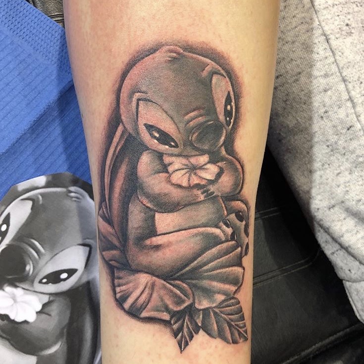 Zwart-wit Stitch tattoo met bloem en bladeren op onderbeen.