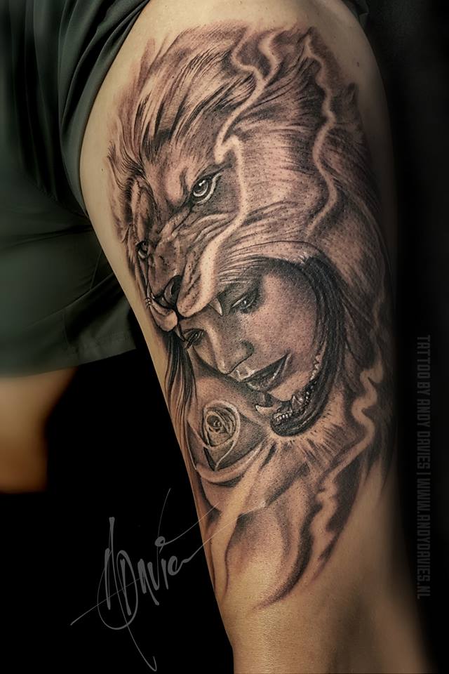Realistische tattoo van een vrouw met een leeuwenhoofdtooi en een roos.