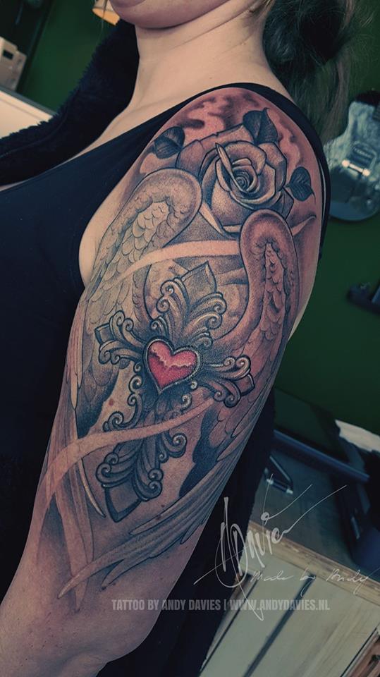 Groot kruis met rood hart, vleugels en roos op bovenarm.
