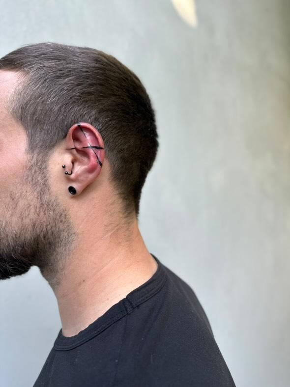 Abstracte zwarte lijnen tattoo op het oor.
