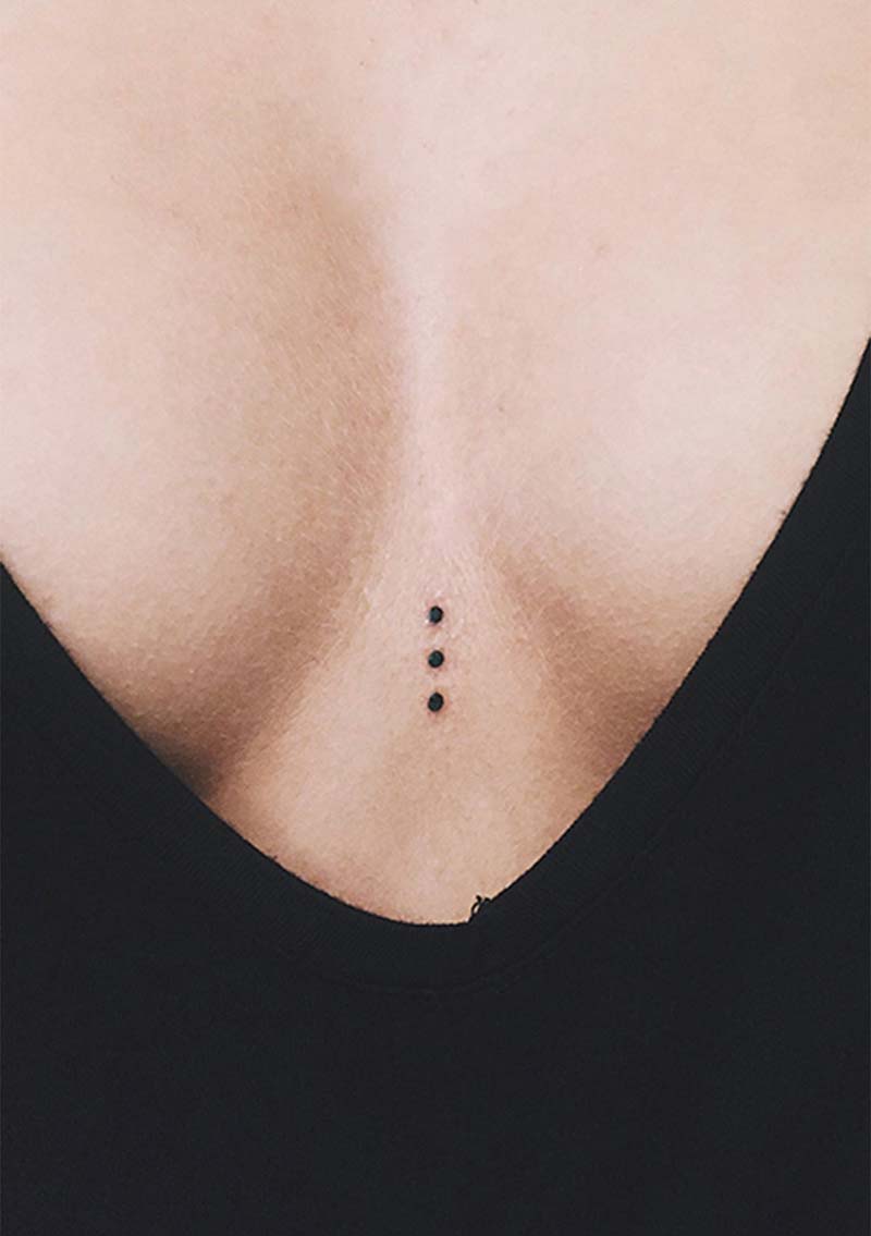 Minimalistische tattoo van drie verticale stippen op het borstbeen.
