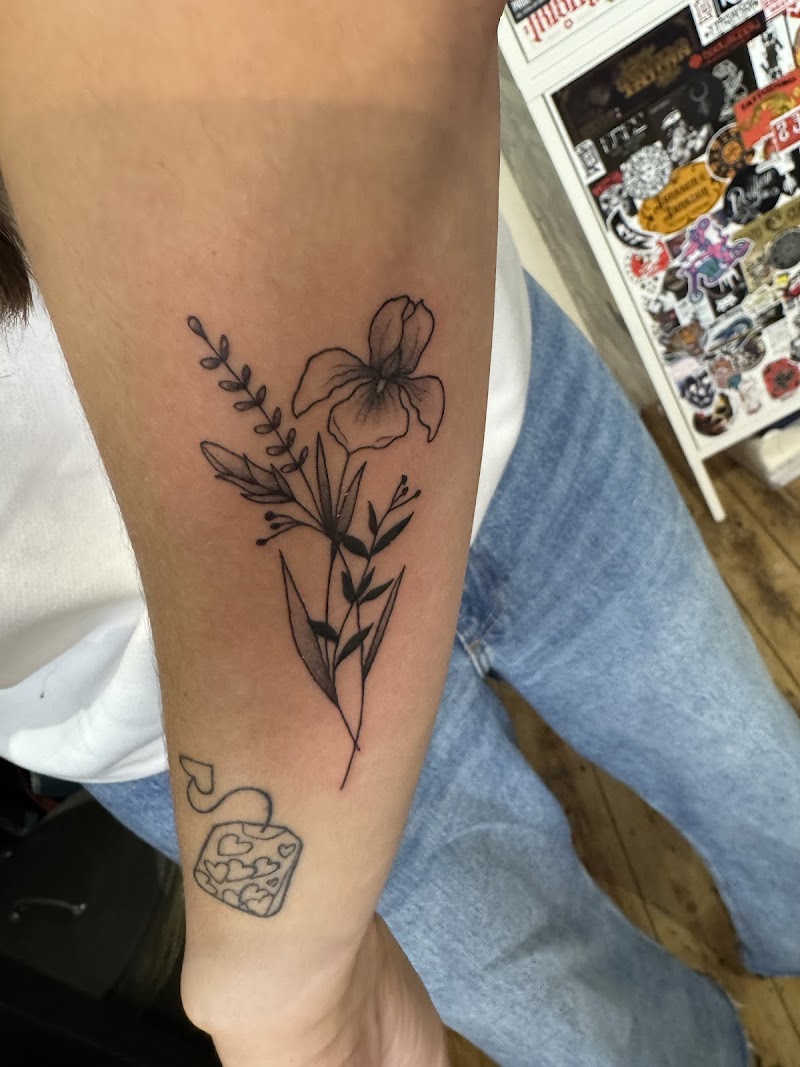 Fineline bloemen en theezakje op onderarm.