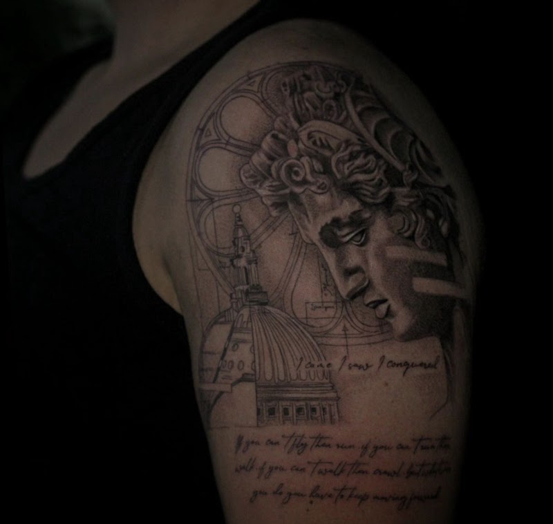 Realistische David standbeeld met architectuur en tekst op bovenarm.
