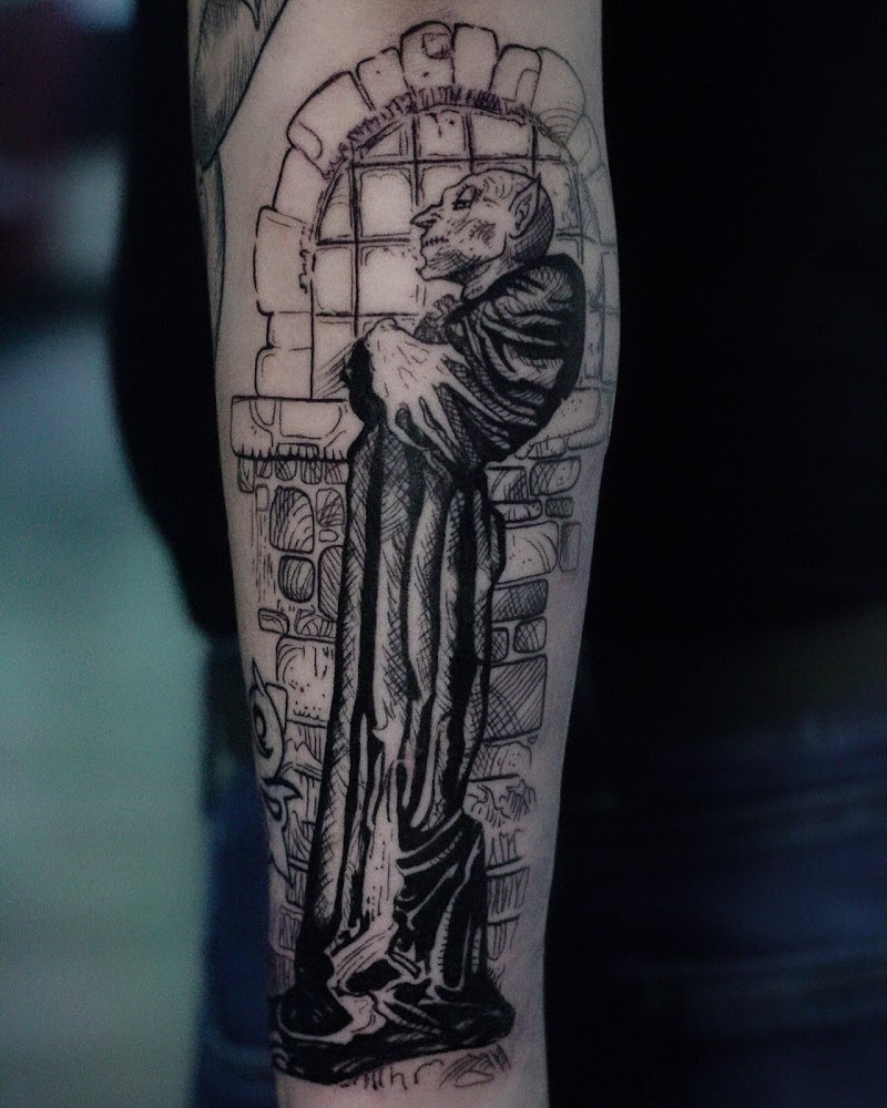 Blackwork tattoo van Nosferatu in een stenen raamkozijn op de onderarm.