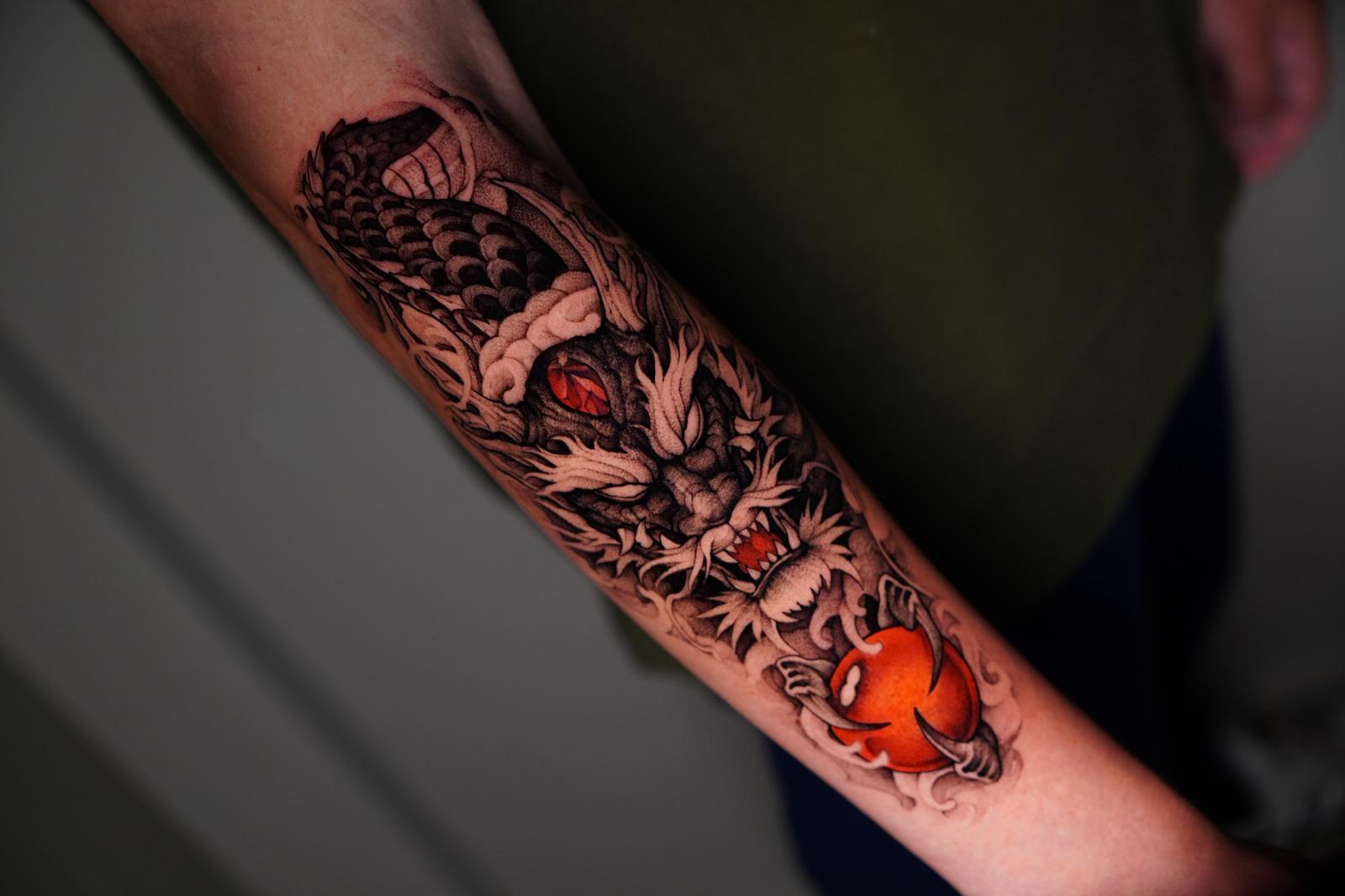 Gedetailleerde drakenkop met rode bol op onderarm.