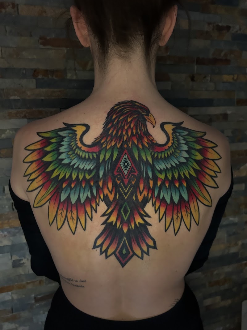 Kleurrijke neo-traditionele adelaar op de bovenrug.