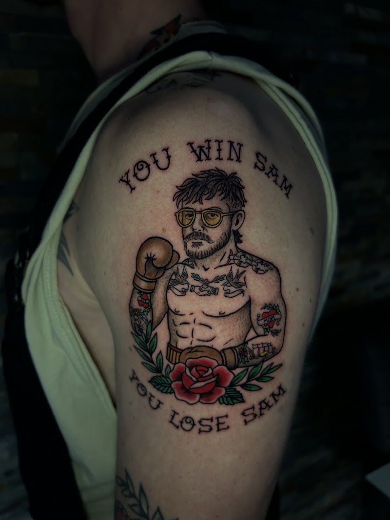 Traditional tattoo van een bokser met tekst "YOU WIN SAM, YOU LOSE SAM".