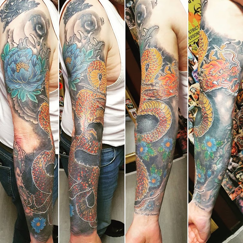 Kleurrijke Japanse draak en bloemen sleeve tattoo op arm.