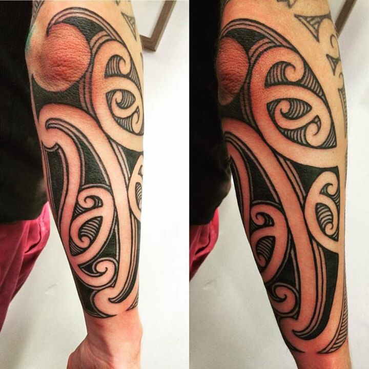 Grote Maori stijl tribal tattoo op onderarm en elleboog.