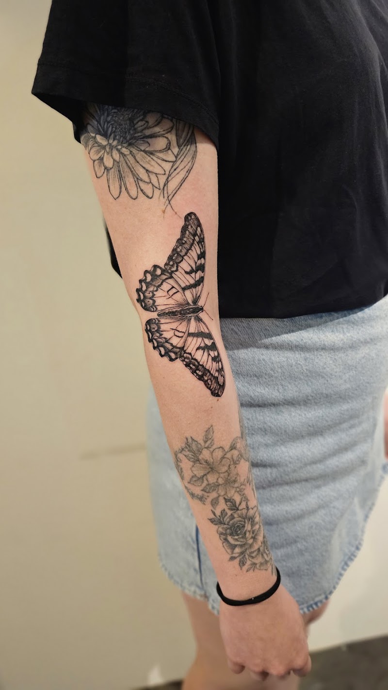 Gedetailleerde zwart-wit vlinder tattoo op de elleboog.