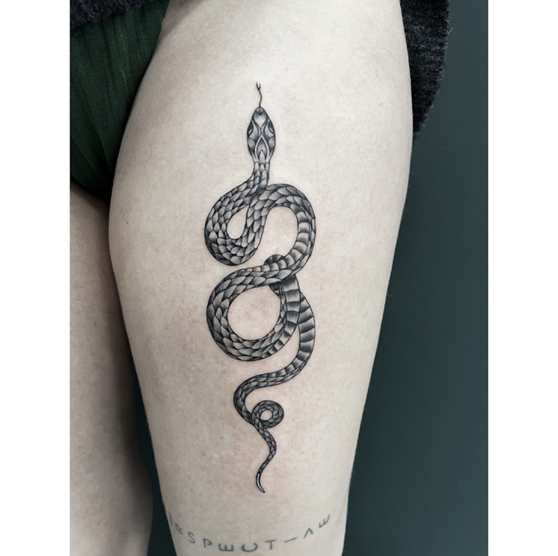 Gedetailleerde zwart-wit slang tattoo op bovenbeen met tekst eronder.