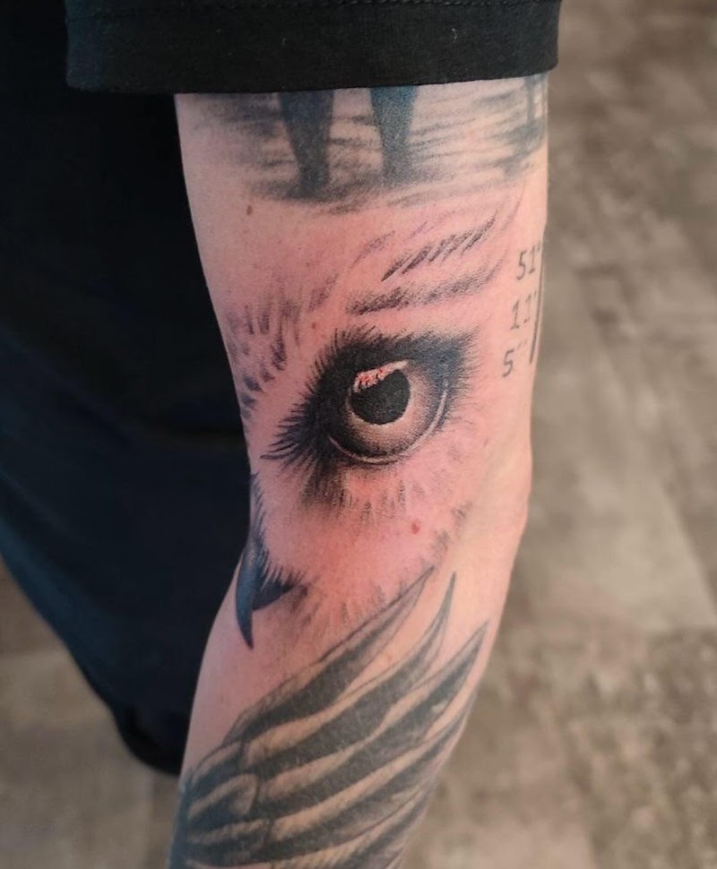 Realistisch uilenoog op de bovenarm.