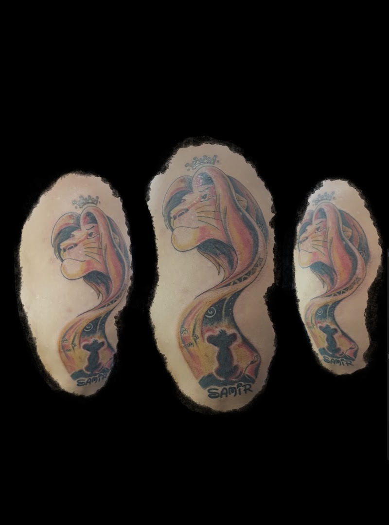 Kleurrijke Lion King tattoo met Simba, kroon en naam 'SAMIR'.