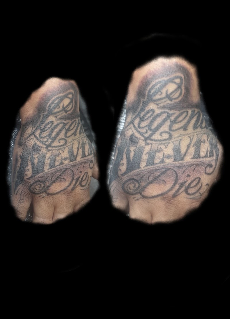 Zwart-wit 'Legends Never Die' tekst tattoo op de hand.