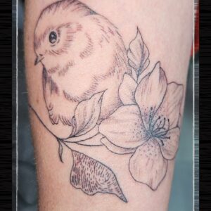 Fineline tattoo van een klein vogeltje op een tak met een bloem.