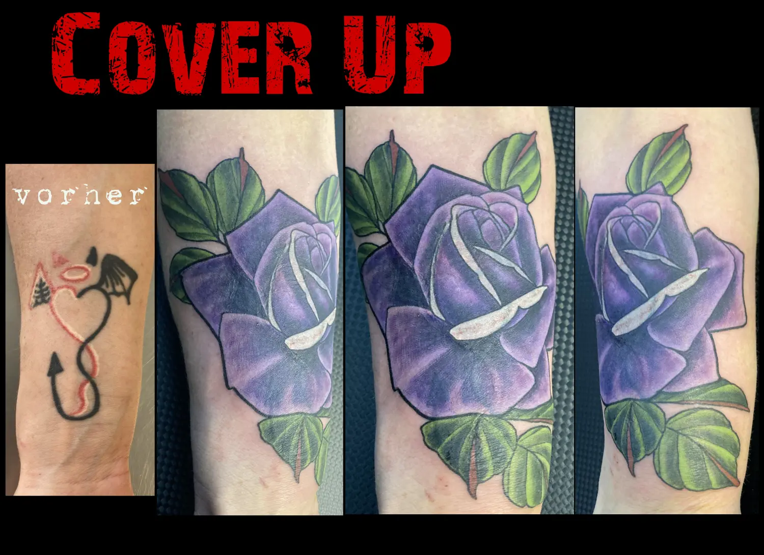 Paarse roos cover-up tattoo over een oud duivelshartje op de onderarm.