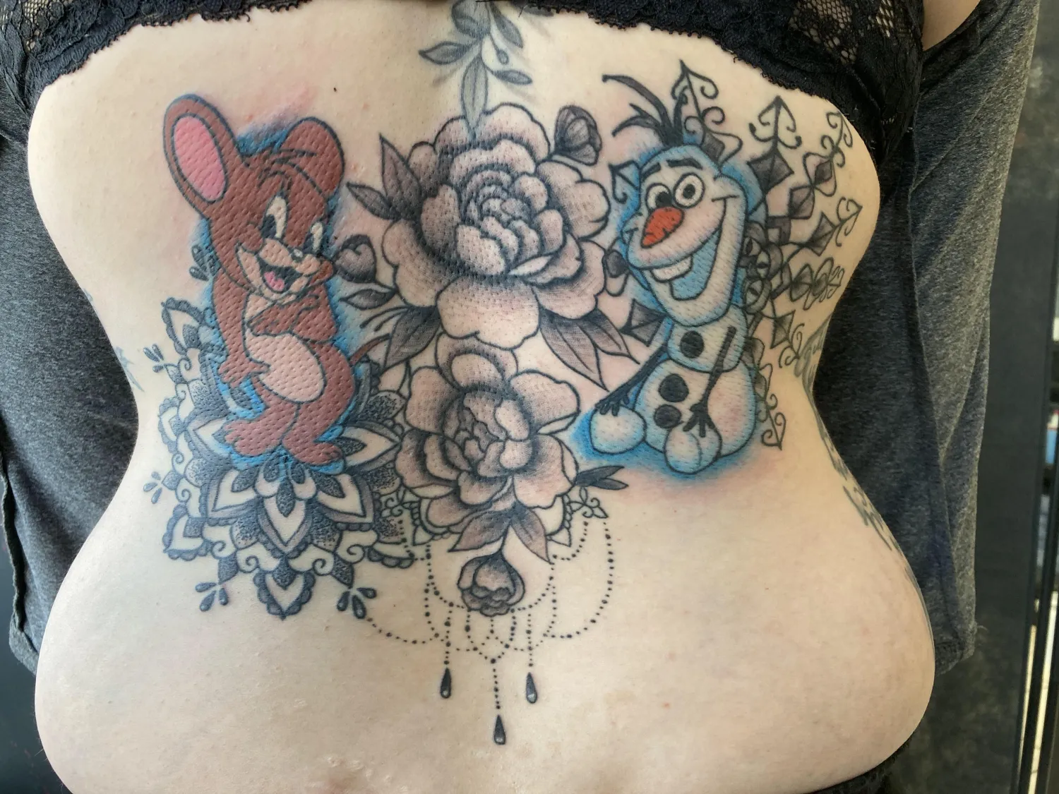 Jerry Mouse en Olaf met bloemen en mandala op onderrug.