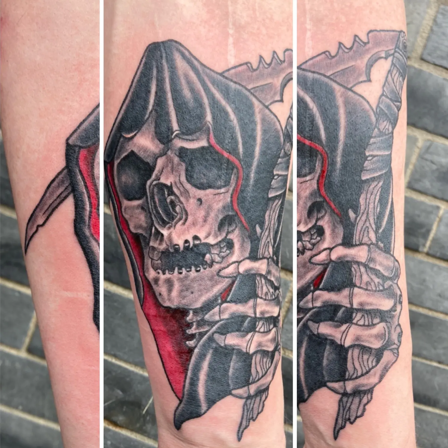Magere Hein met zeis en rode details op onderarm.
