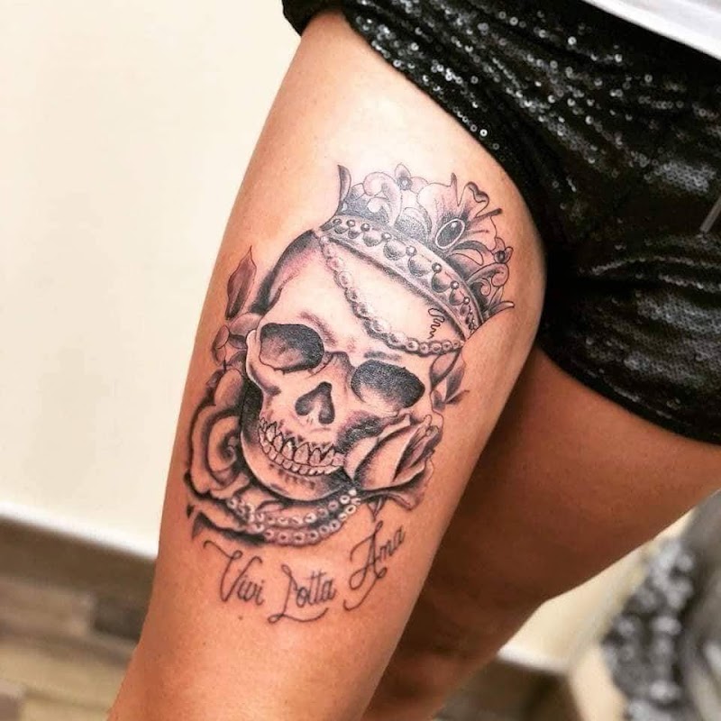 Zwart-wit schedel met kroon, rozen en tekst op bovenbeen.