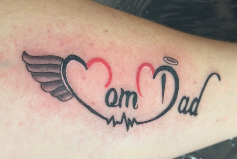 Mom Dad tekst met hartslag, vleugel en halo.
