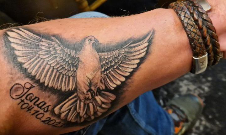 Zwart-wit duif in vlucht met naam 'Jonas' en datum op onderarm.