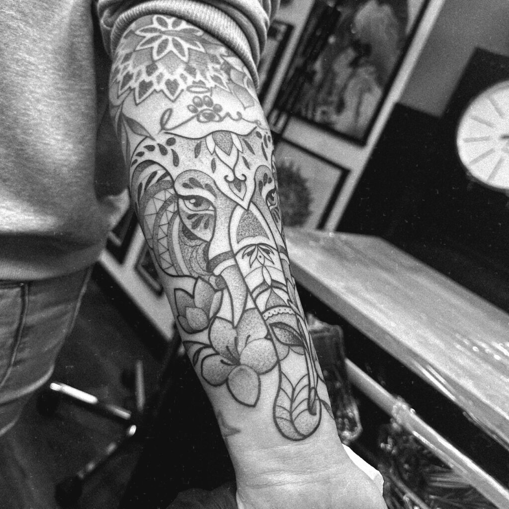 Zwart-wit olifant tattoo met mandala en bloemen op onderarm.