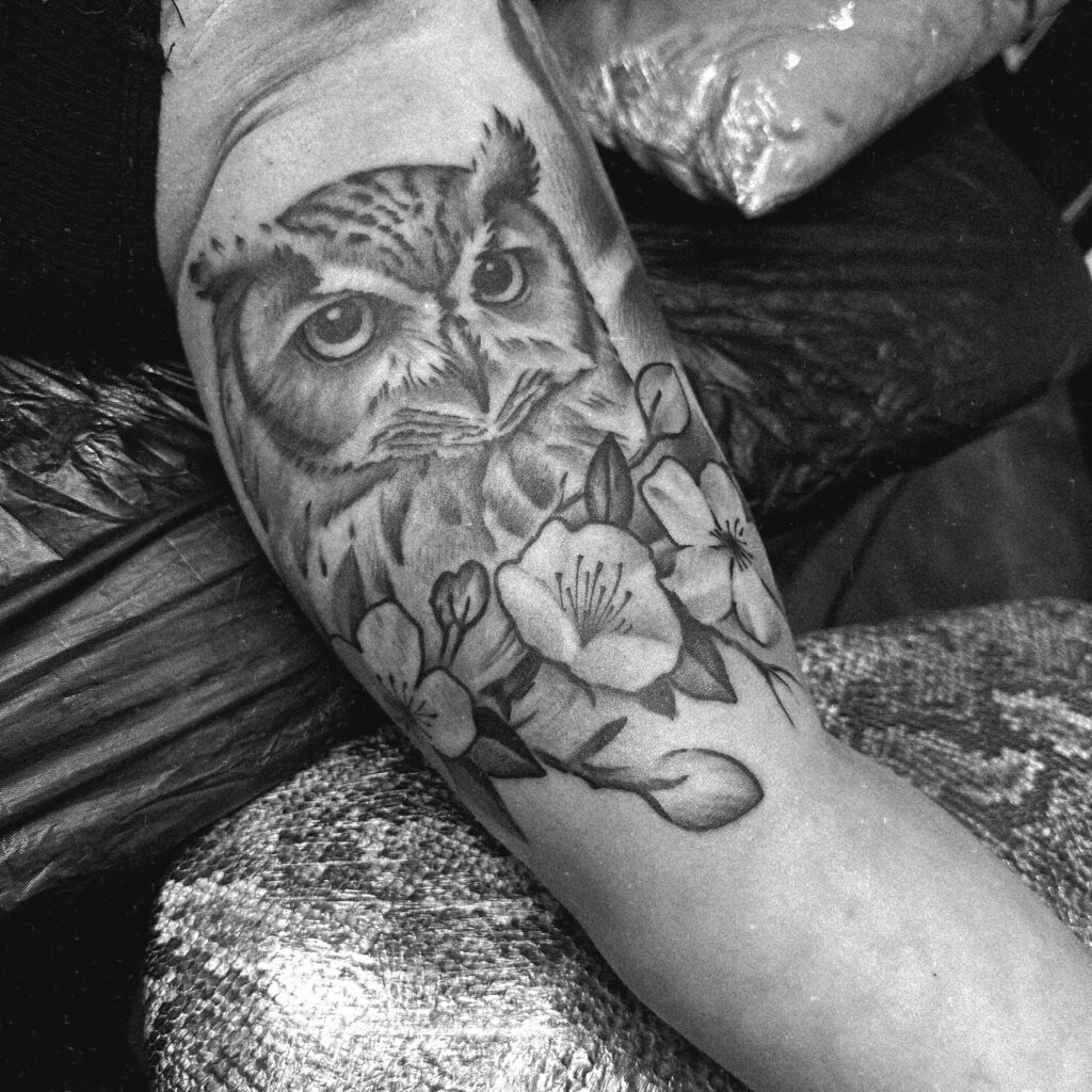 Zwart-wit tattoo van een uil met kersenbloesem op de bovenarm.