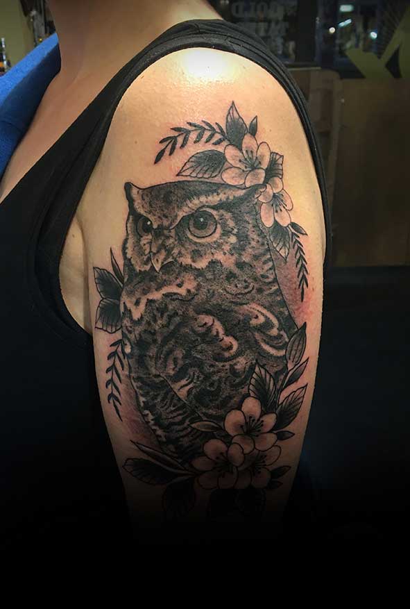 Zwart-wit uil met bloemen en bladeren op de bovenarm.