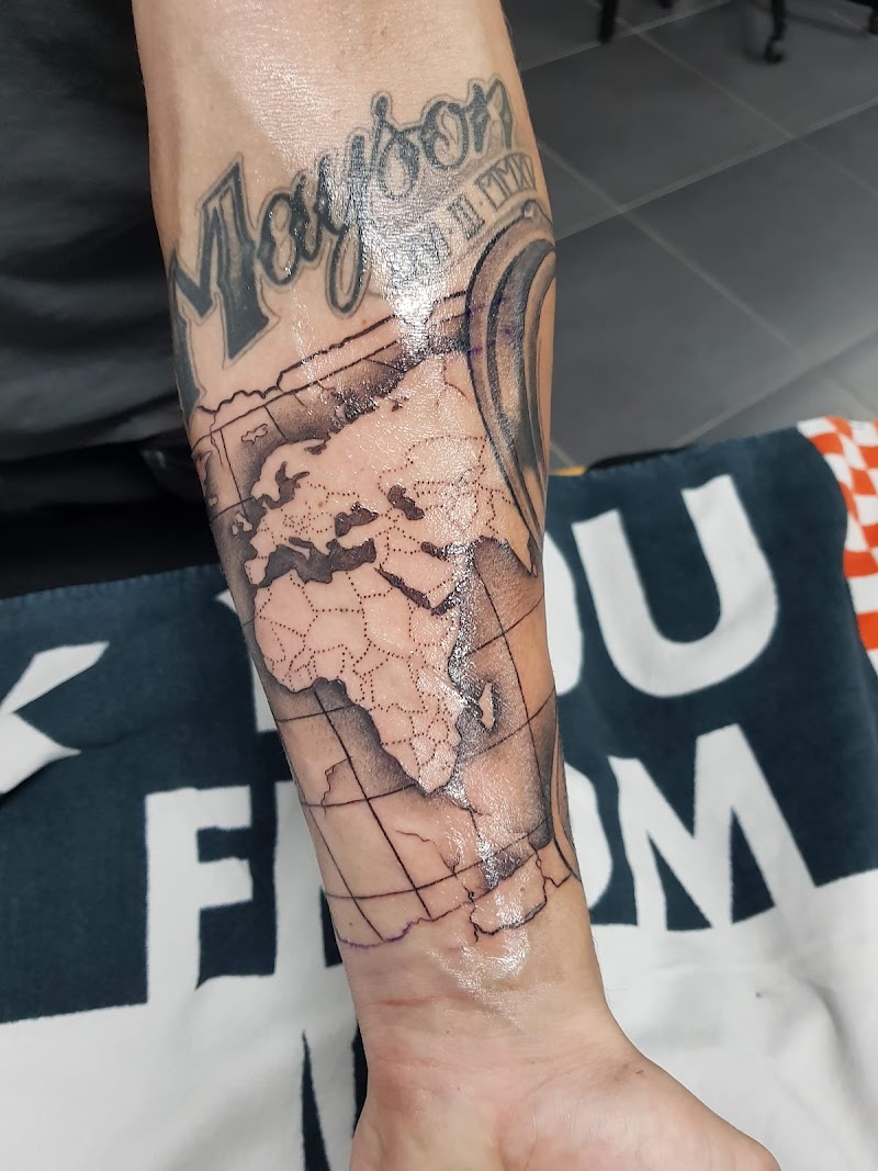 Wereldkaart met naam 'Mayson' en datum op onderarm.