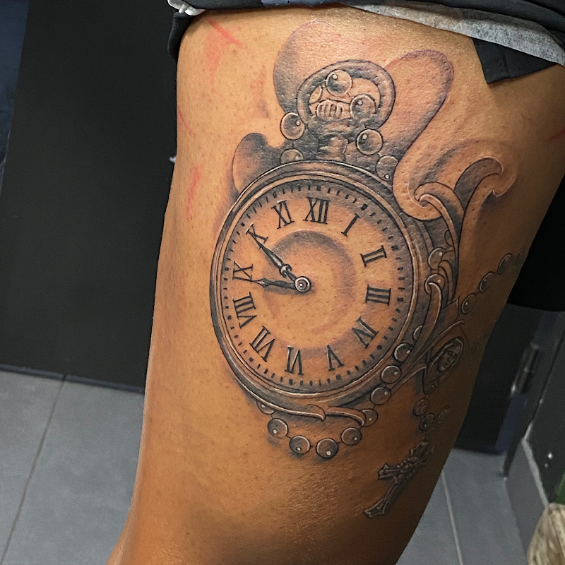 Gedetailleerde black & grey tattoo van een zakhorloge met rozenkrans en kruis.