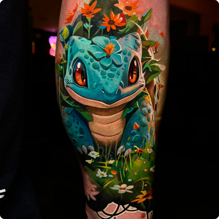 Realistische Bulbasaur Pokémon tattoo met bloemen en natuur.