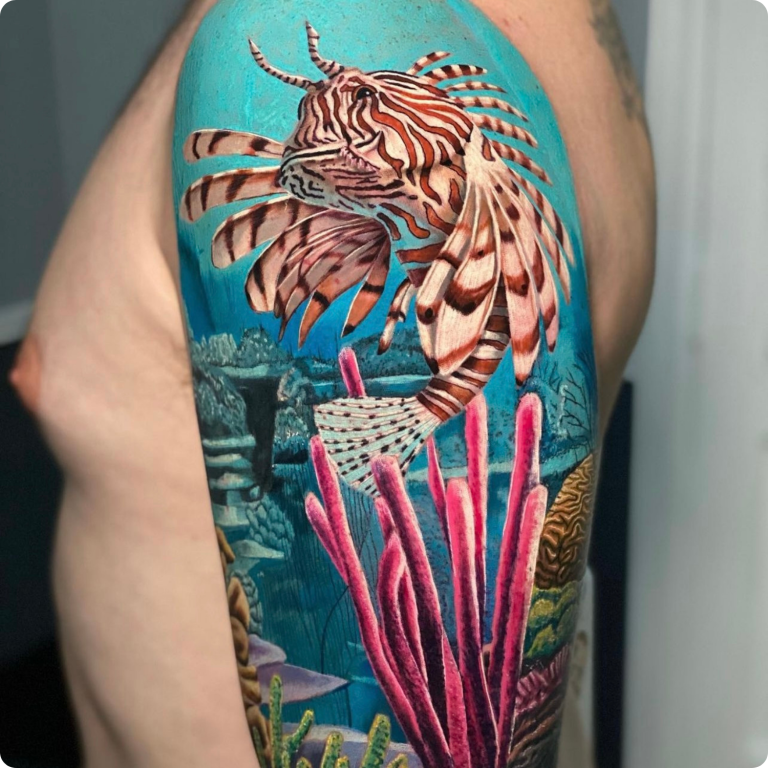 Realistische koraalduivel in onderwaterwereld op bovenarm.