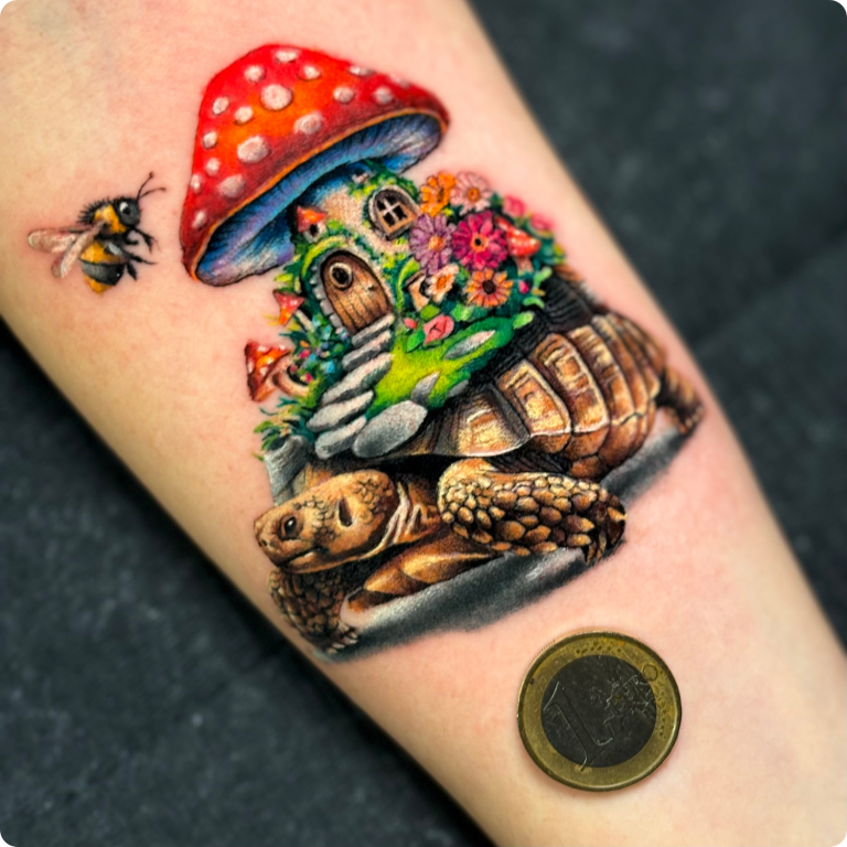 Kleurrijke schildpad met paddenstoelhuisje en bij op de arm.