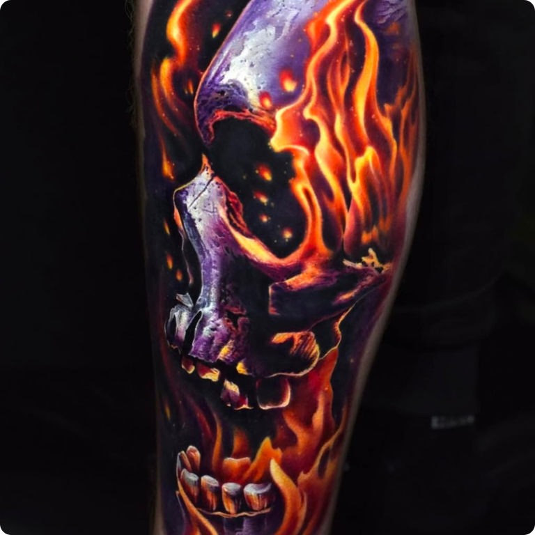Realistische schedel omgeven door vlammen op het onderbeen.