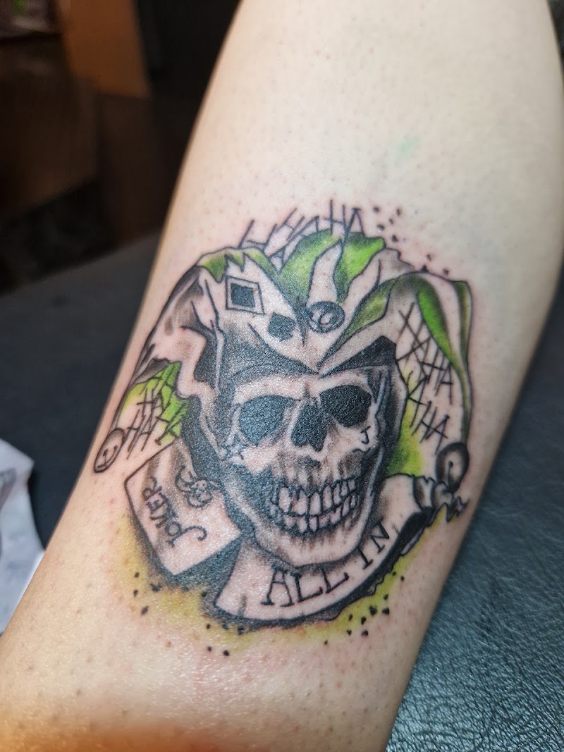 Schedel met narrenkap, speelkaarten en tekst "ALL IN".