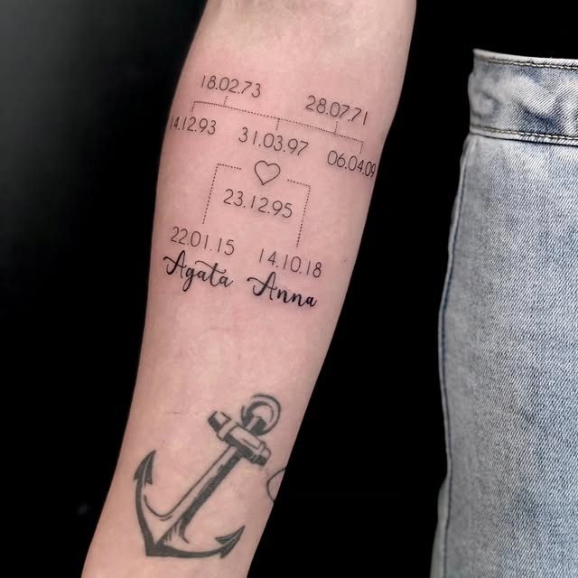 Fineline stamboom met data en namen, en een anker op de onderarm.