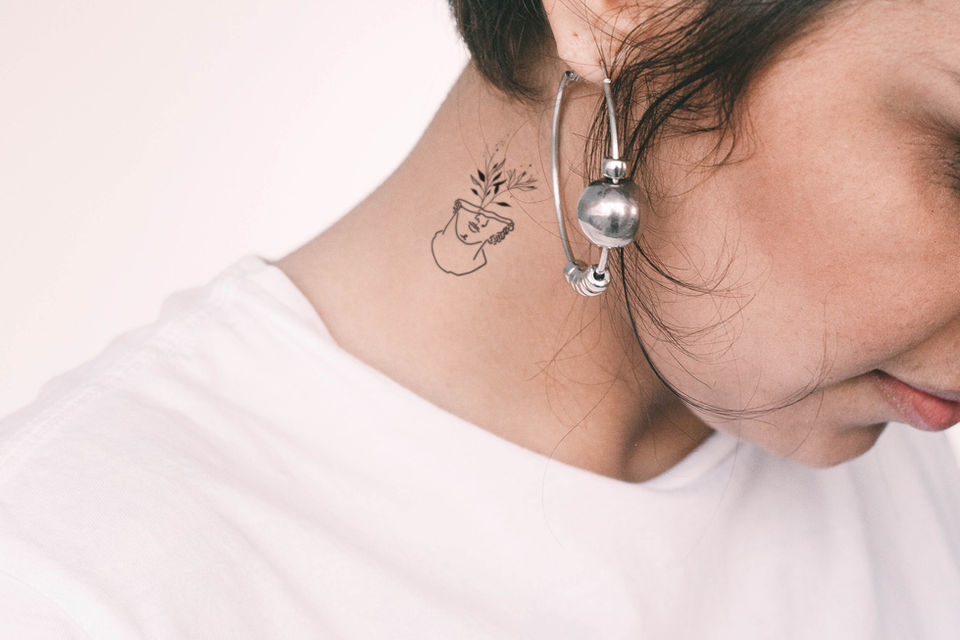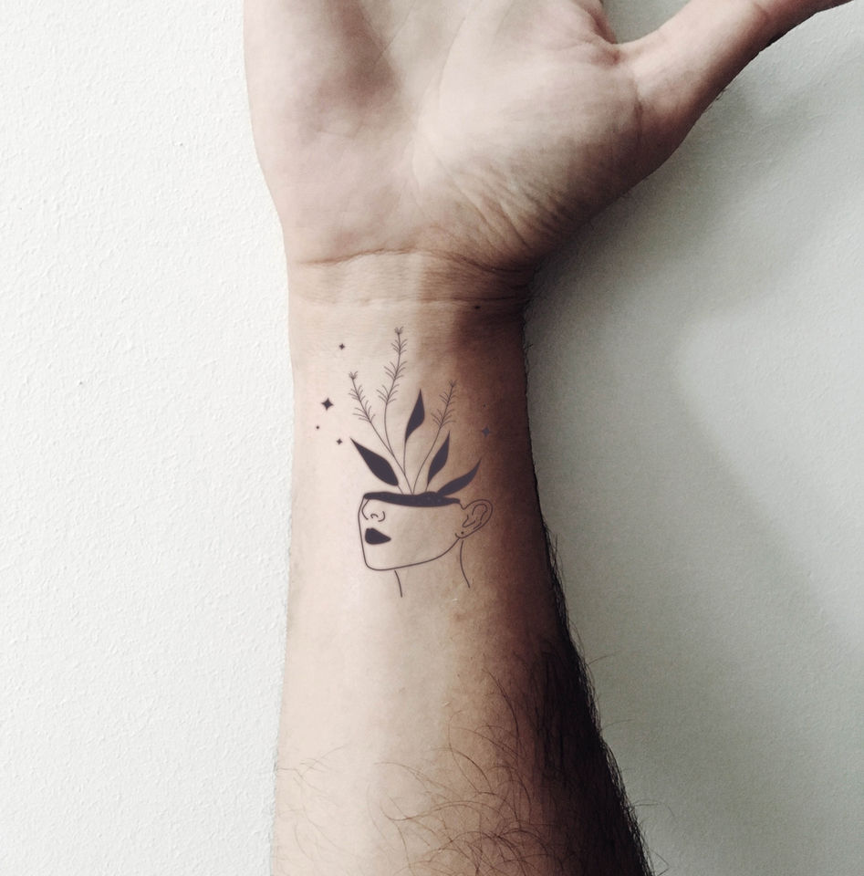 Minimalistische tattoo van een hoofd met planten en sterren op de pols.