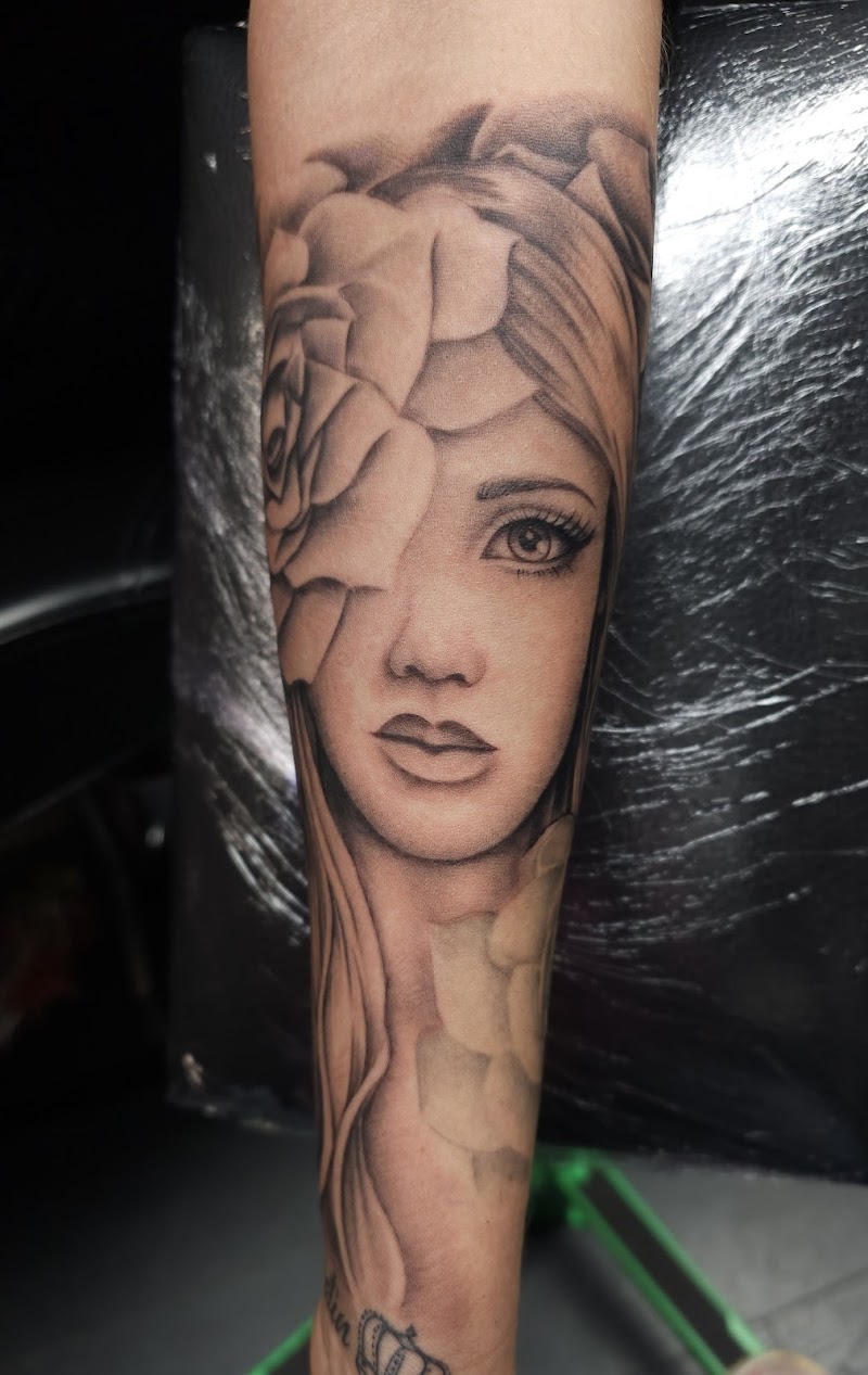 Realistisch portret van een vrouw met een grote roos in haar haar op de onderarm.