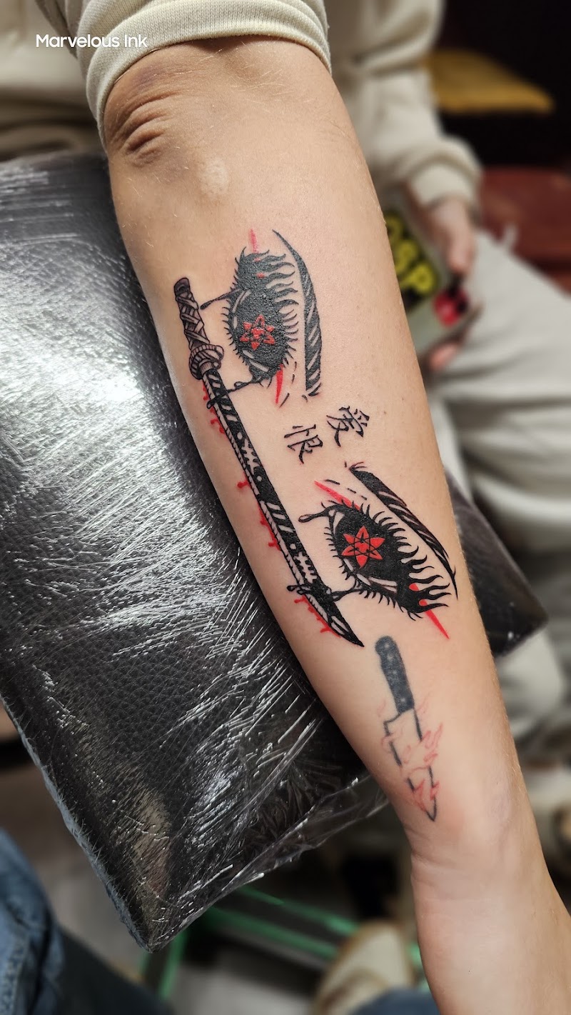 Anime tattoo met katana, Sharingan ogen en Japanse tekst op onderarm.