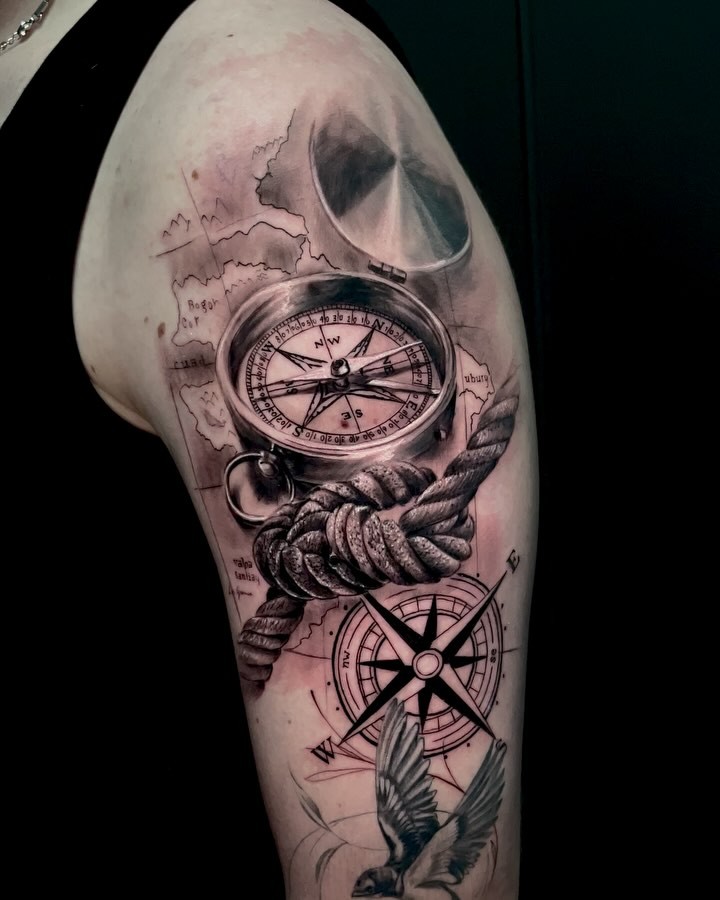 Realistische kompas, touw en landkaart tattoo op bovenarm.