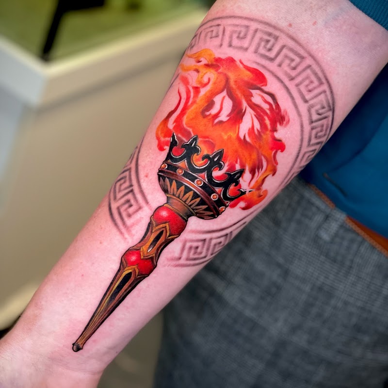 Kleurrijke fakkel met vlammen en Grieks patroon op onderarm.