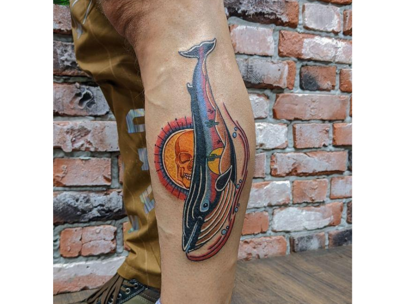 Traditionele tattoo van een walvis met een woestijnlandschap en schedel erin.
