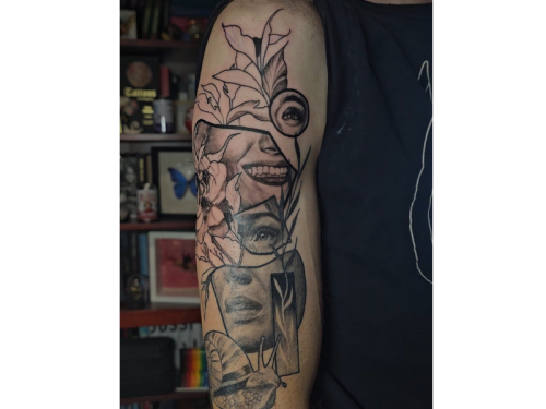 Surrealistische half-sleeve met gezichtsfragmenten, bloemen en een slak.